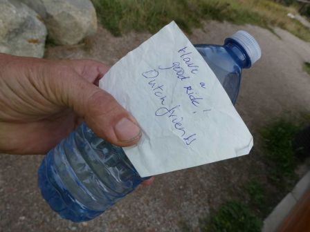 Heureusement, un peu plus loin après une longue montée, je croisai trois ouvriers des routes (dont une femme) qui terminaient leur journée. Ils me demandèrent si je n'avais besoin de rien. Ils me donnèrent deux bouteilles d'eau. Un peu plus loin en repassant, la femme me donna une troisième bouteille et du chocolat ... ce que j'aime particulièrement comme vous le diront celles et ceux qui me connaissent. En fait une belle histoire d'eau et de chocolat ... !